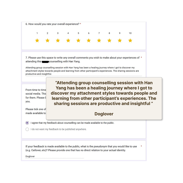 The consultation session is a 30-minute online video call where we can get to know each other and explore what brings you to counselling. During this session, you can share any concerns or questions you have, and figure out if you feel comfortable working with me. I will try my best to clarify your queries and explain further about what to expect for counselling.