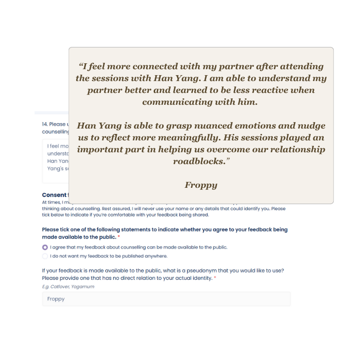 Hi, I'm Han Yang, a registered counsellor. I help couples and individuals create deeper connections and work through challenges with empathy and understanding.